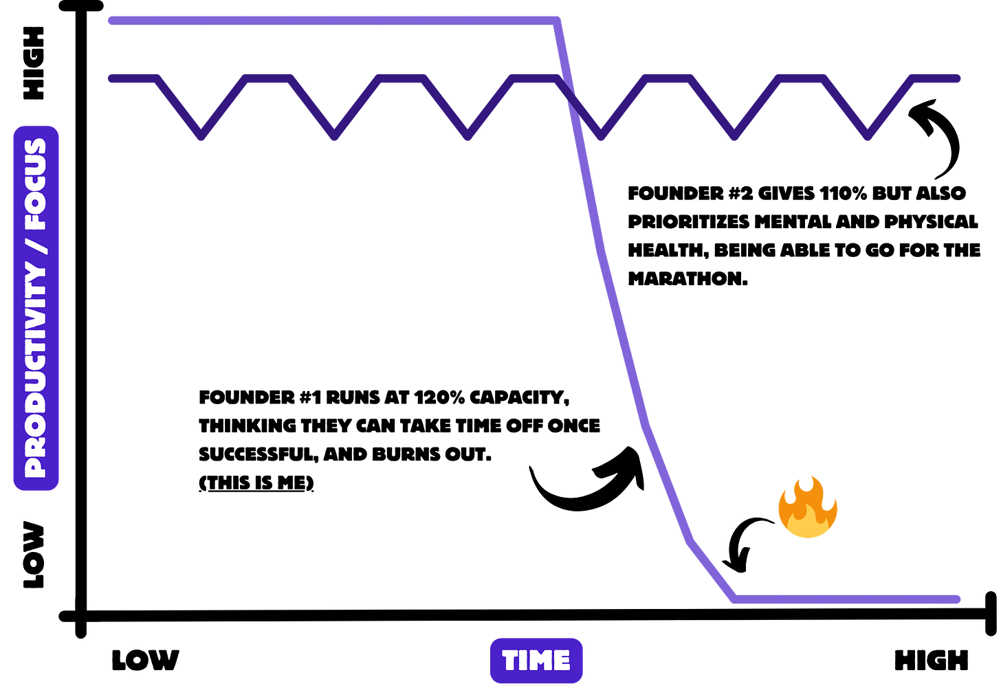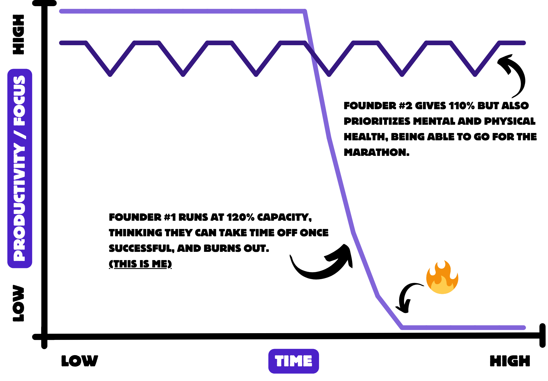 No startup dream is worth sacrificing your health and sanity over. You need sustainable habits from day one - eating well, exercising, and taking real downtime. Don't try to power through burnout. It will catch up and take you down faster than you imagine. Pace yourself for the ultra-marathon ahead instead of burning out before really getting started.